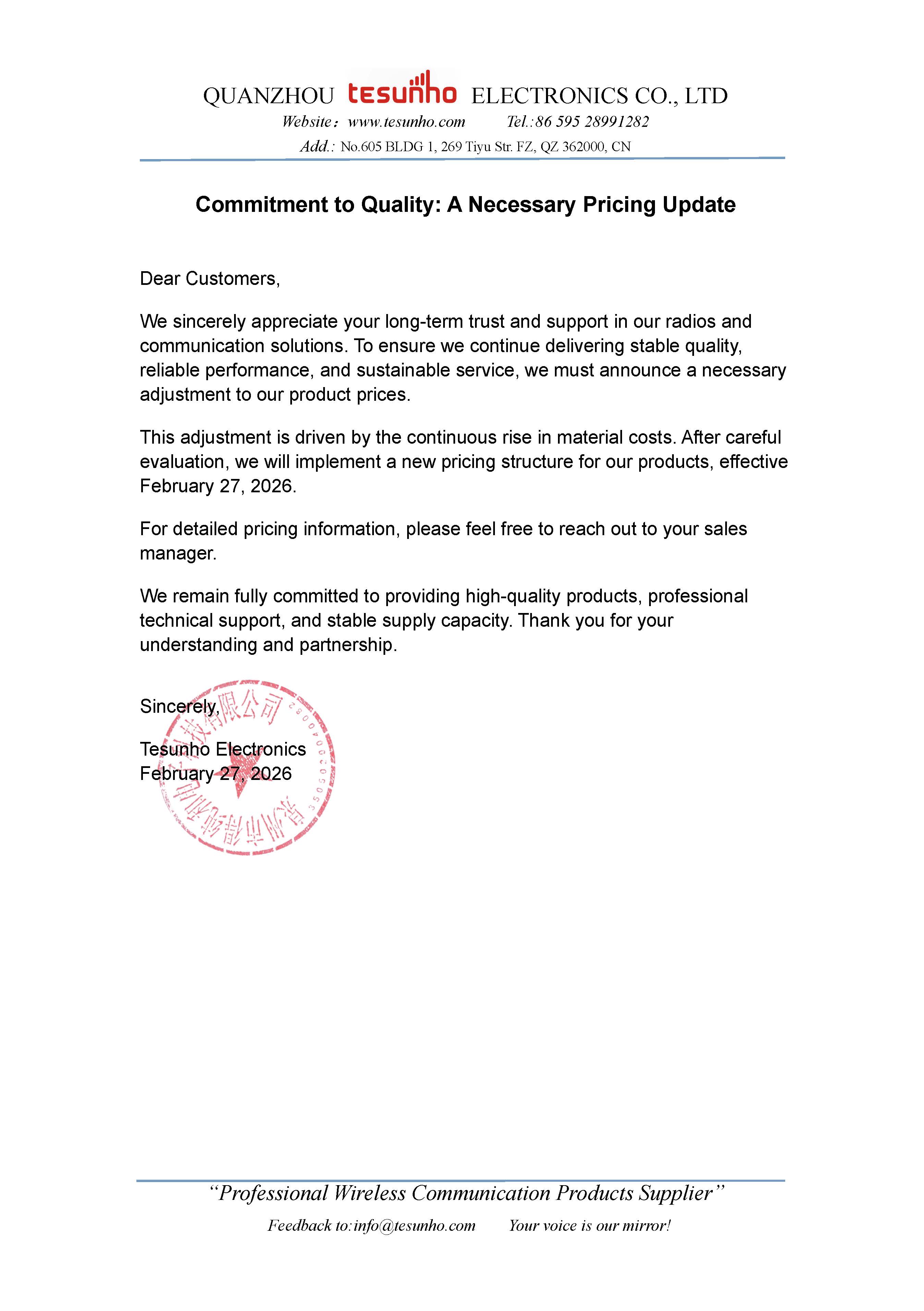 Commitment to Quality: A necessary pricing update